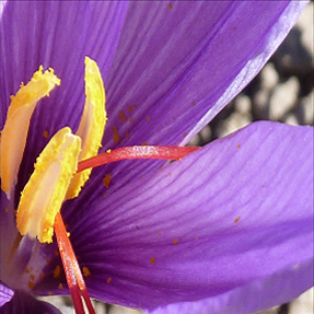 La fleur de couleur violette à rose est veinée avec six tépales ovales, c’est-à-dire trois pétales et trois sépales. Au cœur de cette fleur, se situe l’androcée : trois étamines jaunes chargés de pollen et un pistil rouge sang divisé en trois stigmates. De ce pistil, après séchage, résulte le célèbre safran.
